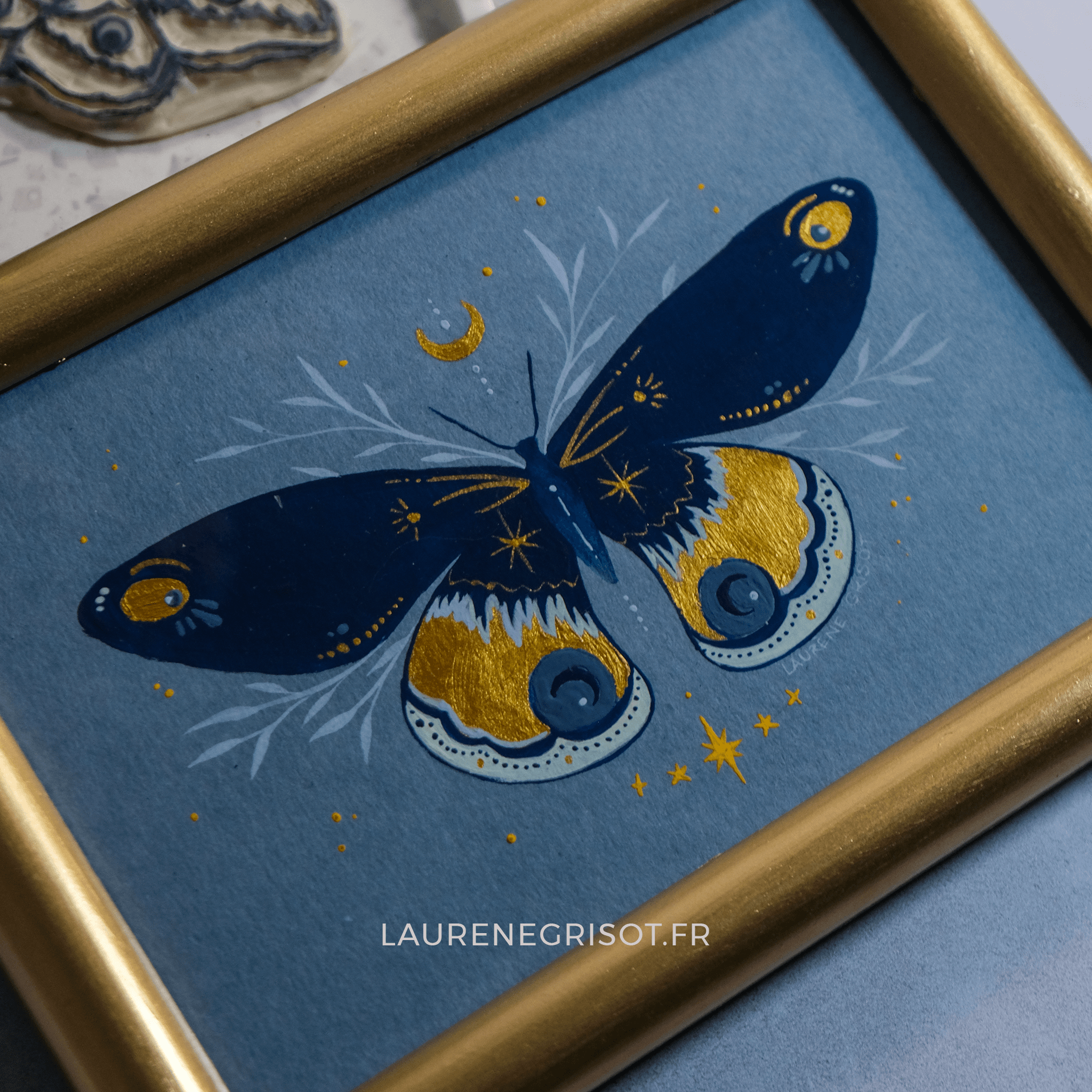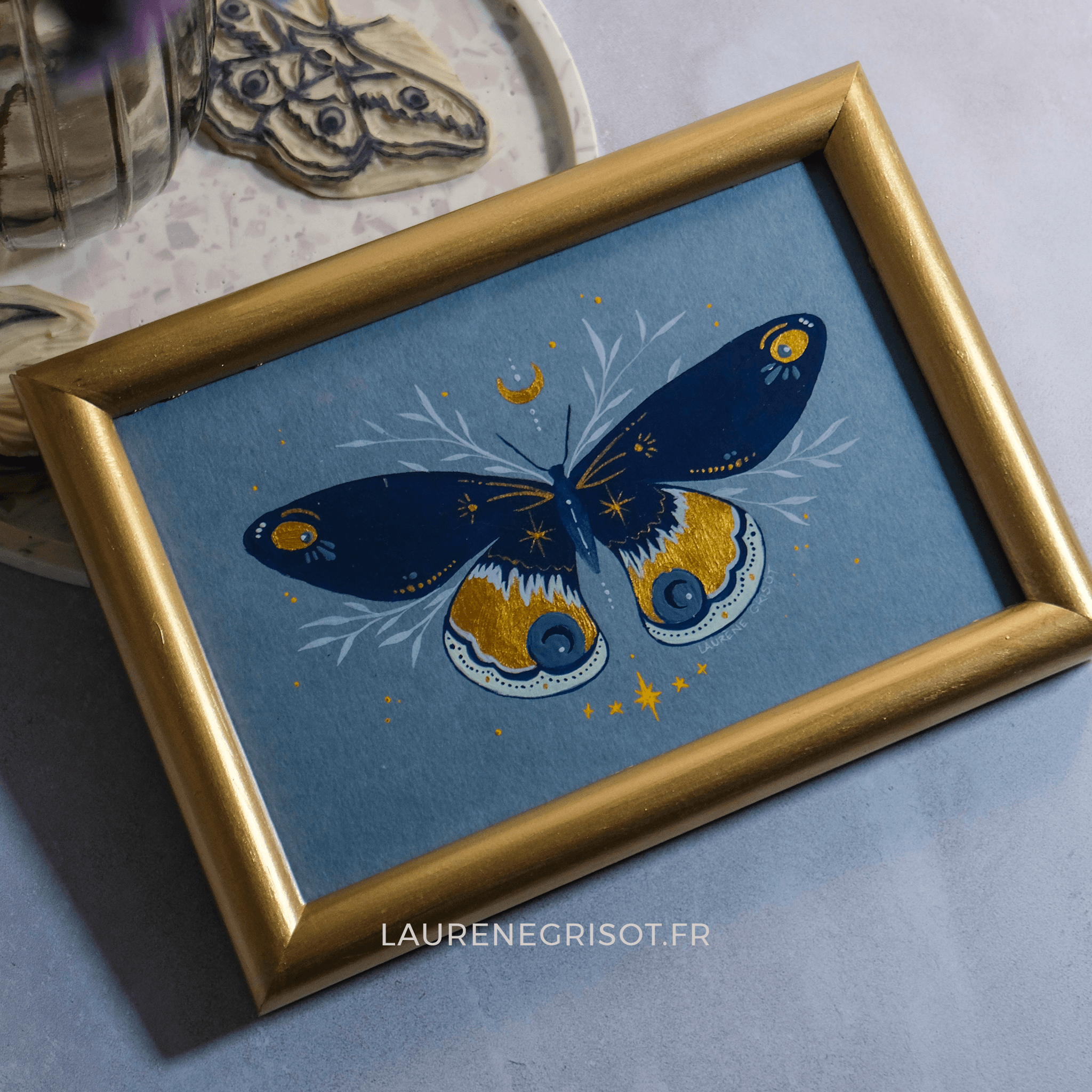 Peinture acrylique et aquarelle irisée sur papier épais, encadrée dans un cadre doré vintage chiné, légèrement patiné, avec ses petites imperfections qui ajoutent du caractère et de l’authenticité. Chaque pièce est unique.
